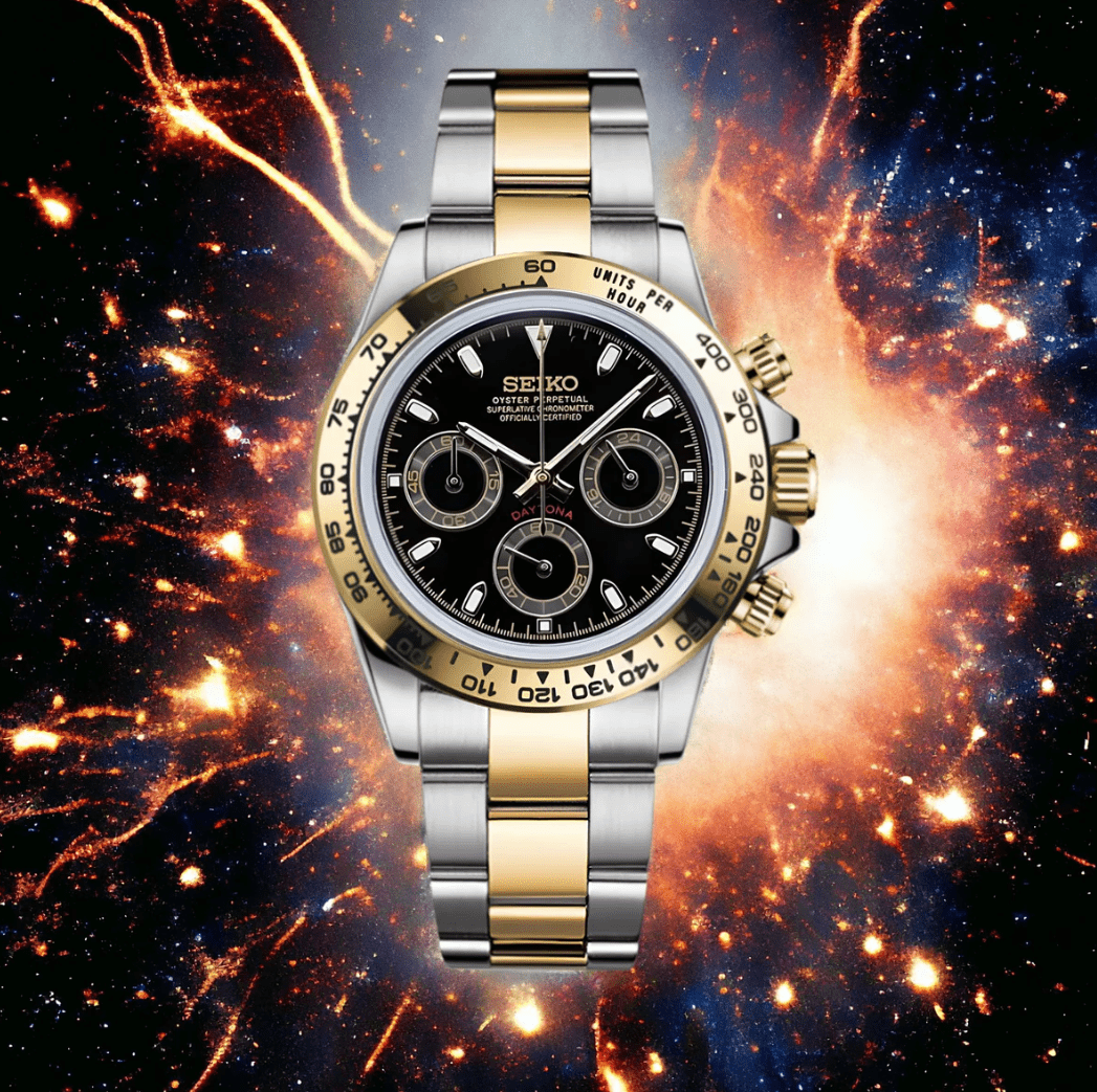 Elevate your style with the Daytona Twotone, a custom Seiko VK63 Mechanical Quartz Watch, inspired by the iconic “Daytona” design. This unique timepiece features a Twotone dial, encased in a 40mm stainless steel frame, offering a blend of elegance and precision for watch enthusiasts.