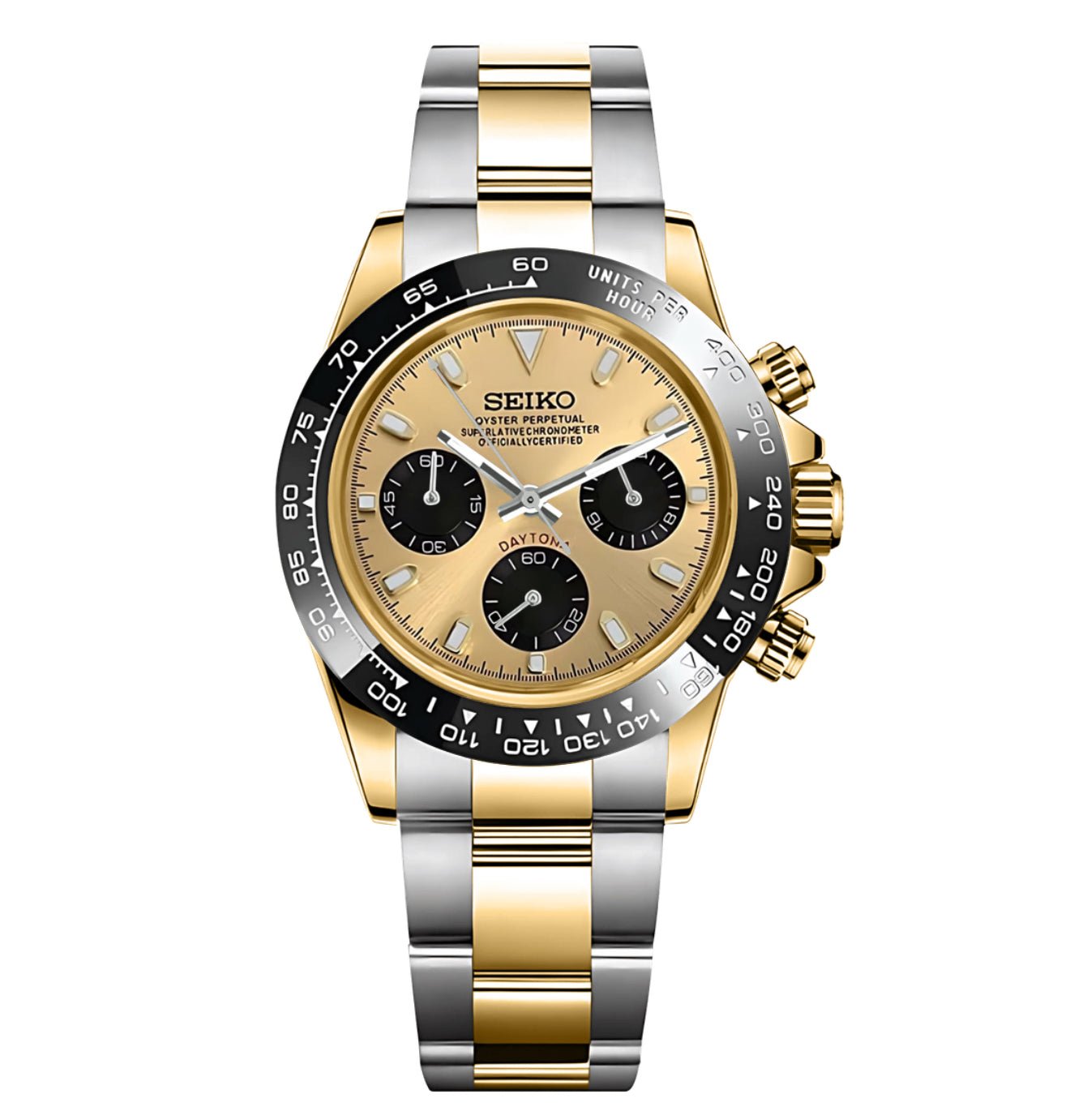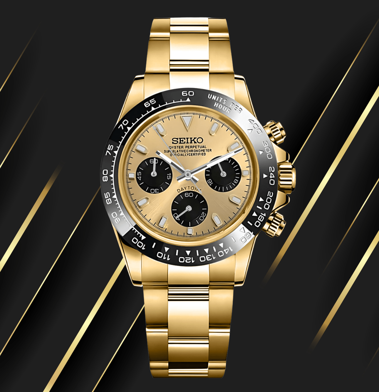 Elevate your style with the Daytona Gold, a custom Seiko VK63 Mechanical Quartz Watch, inspired by the iconic “Daytona” design. This unique timepiece features a Gold dial, encased in a 40mm stainless steel frame, offering a blend of elegance and precision for watch enthusiasts.