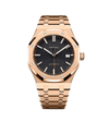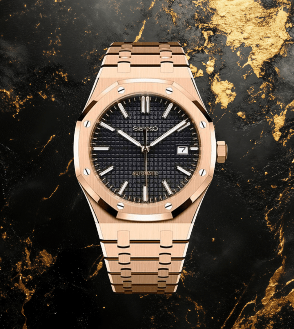 Introducing the Seiko Mod Royal Oak Rose Gold, a custom Seiko NH35 Automatic Watch inspired by the iconic Royal Oak design, meticulously crafted for those who seek elegance and precision. This model features a Rose Gold aftermarket dial and a transparent back piece, allowing a glimpse into the intricate automatic movement.
